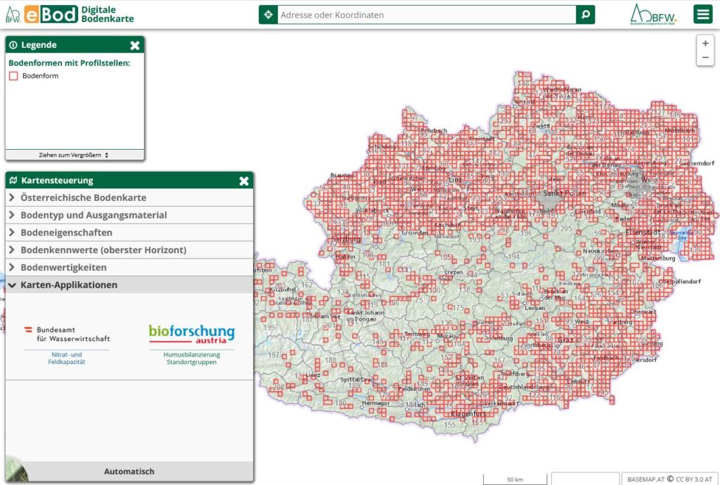 Mit Jahresbeginn 2021 sind in der neu gestalteten Web-GIS-Applikation der Digitalen Bodenkarte Österreichs (eBOD) die thematischen Karten anderer Institutionen neu strukturiert.