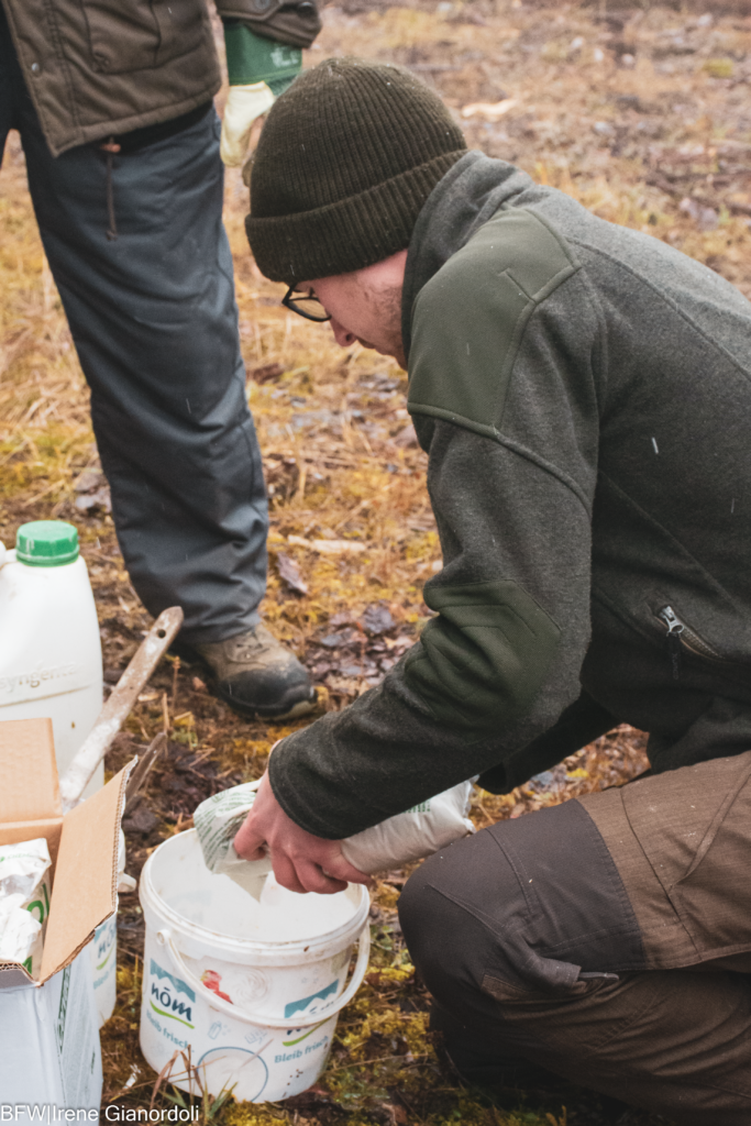 Der erste Arbeitsauftrag war das Freischneiden von bestimmten Waldflächen sowie das Beseitigen von Beikraut. Weiter ging es dann ans Umtopfen von Jungbäumen. Bei all diesen Tätigkeiten wurden Lerninhalte wie Pflanzungen von Bäumen, Maßnahmen gegen das Eschensterben, Anlegen und Pflege von Wäldern vor Ort eingebaut.