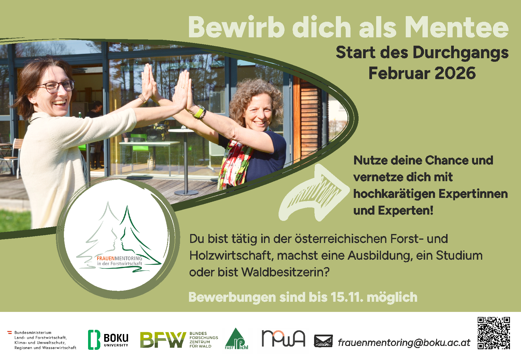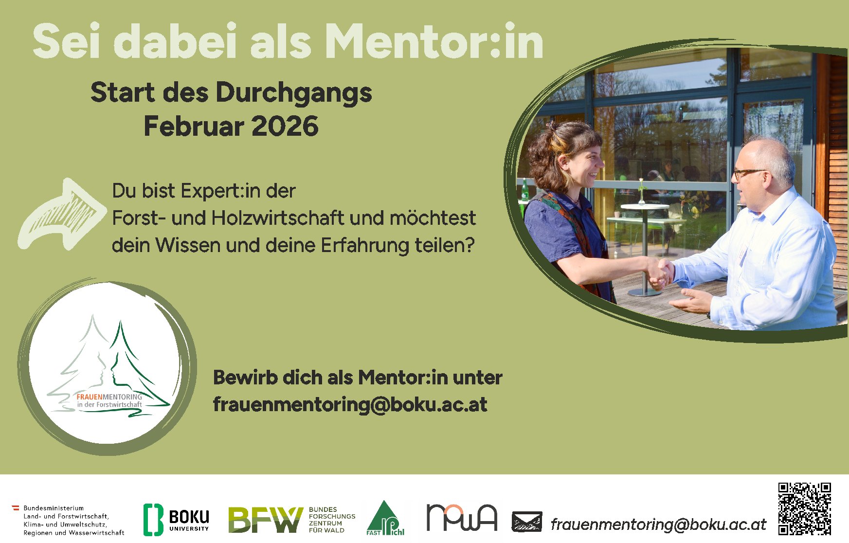 Expert:innen im Bereich Forst- und Holzwirtschaft (holzbasierte Wertschöpfungskette), die ihr Wissen und Erfahrungen teilen wollen und an der Schulung „Art of Mentoring“ – Gender-reflektierendes Mentoring interessiert sind, richten ihre Bewerbungen an:  frauenmentoring@boku.ac.at